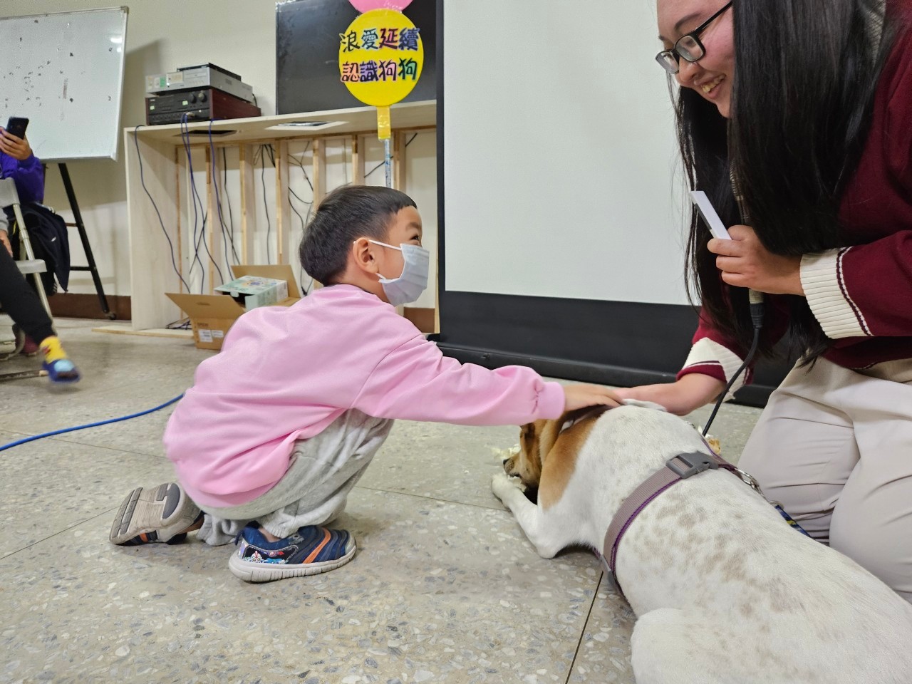 Eden Foundation's “Stray Love Continues”community integration program at the Chichih Social Education Center, the leading creature “Peanut”, a medium-sized beige mix-breed with a gentle character and a tame seven-year-old dog. Peanut was brought to the shelter when he was just over a year old and has been used as a model of the assistance dog. At the beginning of the class, he lay obediently by the instructor's side to observe the children participating in today's activities, and the instructor would from time to time ask the brave children to come up to the stage and interact with the dog.