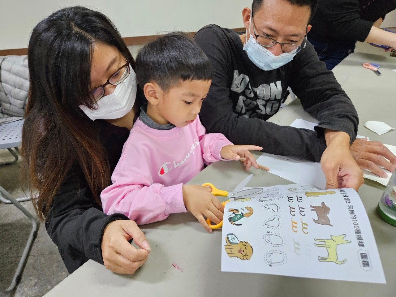 Little Solar and his parents create the paper toy with dog graphics together.
