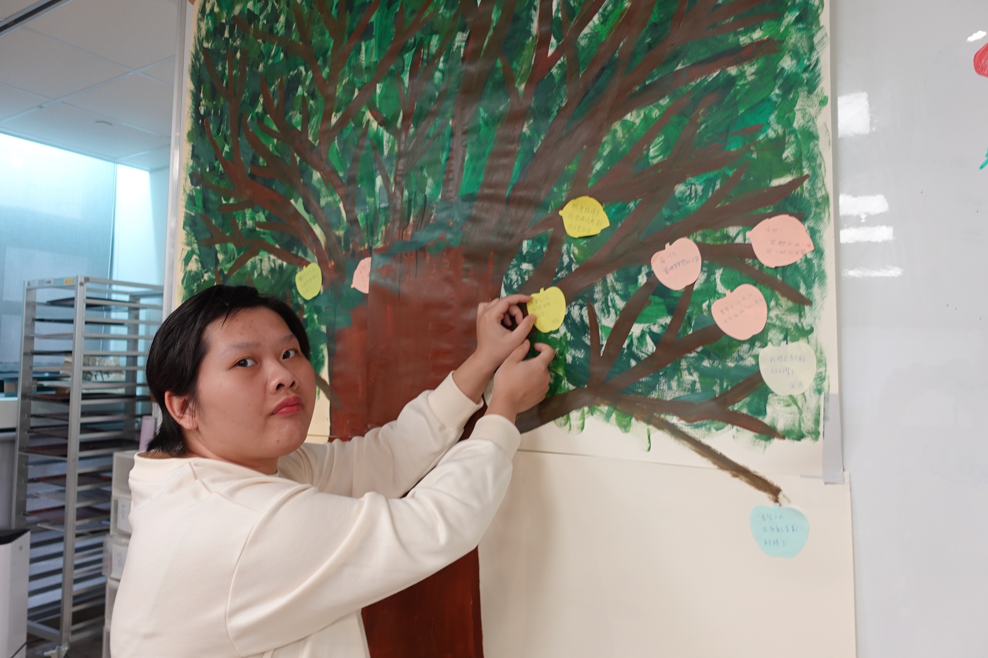 Eden Blessed Clubhouse 's Chief of Section, Ms. Chiu-Huei Chen, said that the theme of this year's exhibition was “Seeing My Good Place” because members had suggested that they would like to let their invited friends and family members see themselves through the eyes of others, so that they could get to know each other better. Therefore, each computer at the venue had a few short videos from members, then viewers could see the feedback given by staff or other members, as the result, members could know how they look at themselves in the eyes of others, and also let their friends and family members see their strengths and qualities. Finally, the members talked about their expectations for the future in the video “Seeing My Good Place”. Unlike previous exhibitions, Chiu-Huei pointed out that this year's video allowed participants to have their own understanding and then go to the “Tree of Growing Together” exhibition area to write down their support for members, Eden Blessed Clubhouse, or the community of people with psycho-social disabilities; members were also able to learn about participants' thoughts through the indirect feedback of the messages.