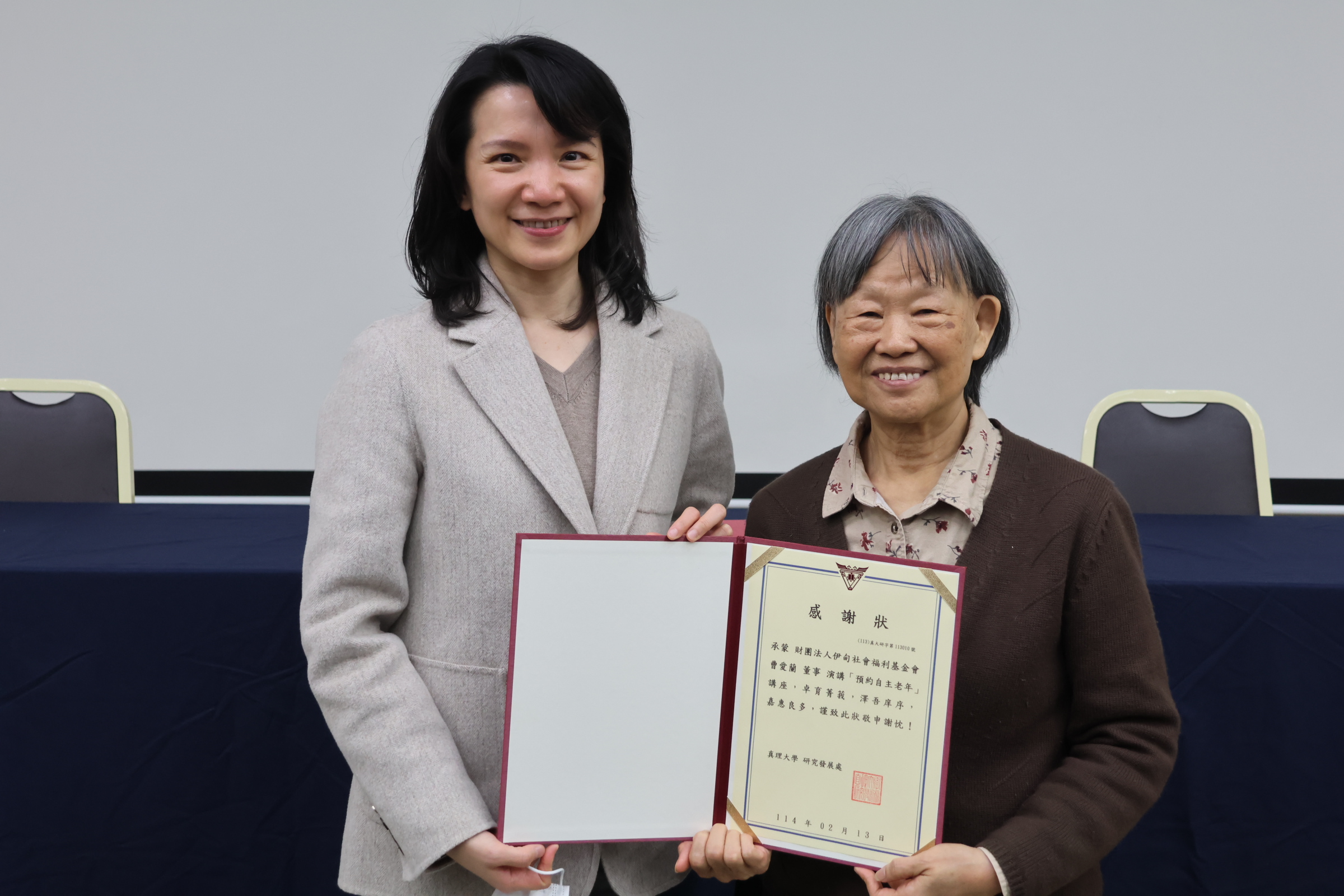 Aletheia University President Yi-Fang Lee (left) thanked Eden's Board Director, Ms. Ailan Tsao (right), for sharing the concept of self-directed aging in a speech for the faculty and staff of Aletheia University.